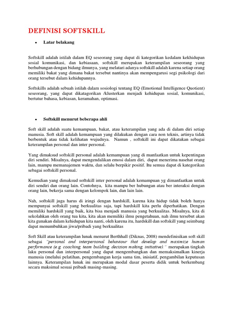 June 2012 Kempen Sss from satusekolahuntuksemua.files.wordpress.com Dalam praktiknya soft skill jauh lebih sulit dipelajari bila dibandingkan dengan hard skill. Karena itu, ada beberapa soft skill yang sangat penting untuk disertakan dalam cv, untuk lebih menarik perhatian perusahaan dan pewawancara kerja tentunya. Beberapa contoh antara lain kemampuan komunikasi, keterampilan bahasa, keterampilan mempengaruhi, empati emosional, dan sifat. Contoh dari kasus ini adalah seorang koruptor merupakan seorang yang mungkin ahli dalam hal keuangan, namun kepintaran itu ia gunakan hanya untuk kepentingan diri sendiri, dan merugikan orang lain. Karena soft skill itu sendiri akan lahir apabila seseorang memiliki motivasi yang besar untuk berubah lebih baik dari sebelumnya. Kecakapan dalam bahasa asing, gelar atau sertifikat, kecepatan mengetik, pengoperasian alat berat, pemrograman komputer. Soft skill adalah kemampuan yang digunakan untuk berhubungan dengan orang lain. Soft skill dalam dunia karir khususnya untuk anda yang sedang bekerja di suatu perusahaan sangatlah penting.